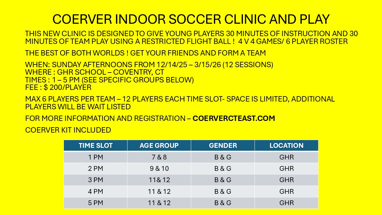 COERVER INDOOR SOCCER CLINIC AND PLAY - SUNDAYS 12/14/25 - 3/14/26
